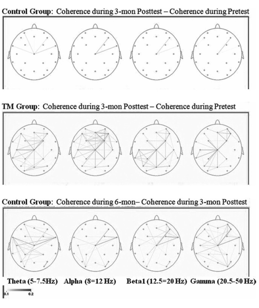 Het resultaat is duidelijk, bij de controle groep is er geen verschil na drie maanden, bij de TM groep is er een sterke stijging van EEG coherentie. Als de controlegroep dan na 3 maanden ook TM leert is er na 6 maanden ook een sterke stijging van EEG coherentie. Ref: Mind & Brain, The Journal of Psychiatry (2011, Vol 2, No 1)