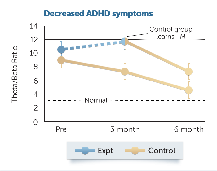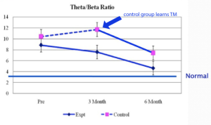 Dit is duidelijk zichtbaar op deze grafiek die evolutie van Thèta/Bèta ratio van hersengolven van de kinderen over 6 maanden weergeeft. Deze ratio is uitzonderlijk hoog bij ADHD patiënten (zie verder), na 6 maanden TM beoefening was ze bijna terug normaal. De scholieren werden meer aandachtig, konden hun impulsen beter controleren, hadden betere organisatorische vaardigheden, en konden beter problemen oplossen. Hun prestaties op school gingen erop vooruit en ze hadden minder, stress, angst en woedeuitbarstingen.