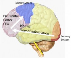 Bij een normaal functioneren van de hersenen gaat de stroom van informatie als volgt: Informatie komt binnen via de zintuigen, wordt naar de prefrontale cortex gestuurd en daar verwerkt, en de genomen beslissing wordt doorgestuurd naar het motorisch gedeelte, die de nodige spieren aanstuurt om te reageren.