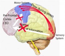 In een toestand van stress verandert deze stroom van informatie. De informatie gaat niet langer langs de prefrontale cortex, maar gaat direct van het zintuiglijk gedeelte naar het motorisch gedeelte.